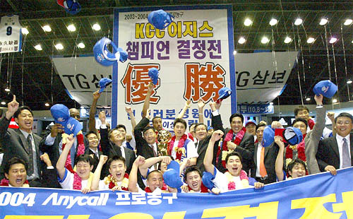 KCC는 10일 원주에서 열린 2003-2004 프로농구 챔피언 결정전 7차전에서 후반에만 3점슛 6개를 성공시키며 원주 TG삼보를 83-71로 물리쳤다.