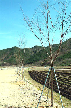 이곳 무주군 설천면 소천리- 이남리 2.2km구간은 태풍'루사'로 인한 수해복구 공사로 제방도로가 설치되면서 지난해 10월 무주군 산림조합이 주당 5만1천7백원하는 왕벚나무 5백40여그루를 식재했으나 줄줄이 20∼30그루가 고사해 흉물스럽게 방치되어 있다.