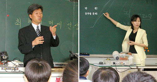 평소와 다른 수업 현장이다. 선뜻 교사들이 나서지 못했던 분야에 NGO 전문가가 일일교사로 투입(?)됐다. 전북환경운동연합 사무국장인 최형재씨(42) 부부가 나란히 초등학교 교단에 섰다. 아내인 김미경씨(42)는 현재 한국마약퇴치운동본부 전북지부 상담실장.