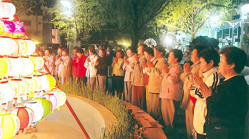 한편 이날 무주군청앞 광장에 설치된 봉축 연등탑은 높이 9m,둘레 23m의 원추형으로 24단 5백48개의 연등을 달아 불기 2547주년을 의인화했다.