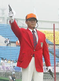 때문에 스타터는 육상 단거리 선수경력은 물론 오랜 연륜이 없으면 총을 잡을 수 없다. 김감독은 20여년째 각종 육상대회 스타터로 활약, 육상계에서는 너무도 잘 알려진 인물.