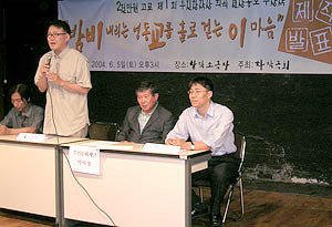 제109회 정기공연작품 '밤비 내리는 영동교를 홀로 걷는 이 마음'(작 최치언·연출 홍석찬) 연습현장. 본격적인 연습에 돌입한 지 한 달째. 15년의 공력을 가진 배우 김경미씨(34)는 "연습을 처음 시작한 날이나 지금이나 불안한 마음은 마찬가지”라고 말한다. 무대와 배우의 관계가 보통 "무대에 서기 전 설레임이 쉽게 식지 않는 인연”이기도 하지만, 이번 작품은 의미하는 바가 더 크다. 지금까지 올렸던 작품 중에서 가장 고가(高價)의 대본(우진문화재단의 1천만원 상금 공모 당선작)을 초연하기 때문. 그래서 지난 5일 오후 3시 전주 창작소극장에서 ㈜우진건설 김경곤 대표와 우진문화재단 양상희 이사장, 곽병창·장인숙·이철량 이사 등 우진문화재단 관계자와 전북연극협회 김기홍·류영규 전 회장 등 연극계 인사들이 참석해 모처럼 제작발표회를 갖기도 했다.