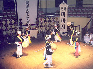 공연은 문굿과 비나리, 삼도농악가락, 사물판굿으로 구성됐다. 사물판굿은 여러 놀이와 진풀이를 순서대로 짜서 갖가지 기예를 보여주기 위해 벌이는 풍물놀이. 상모를 쓰고 하늘을 휘저으며, 발로 땅을 박차고 움직이는 역동적인 몸놀림과 호흡이 특징이다. 문의 063)280-7006