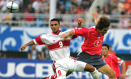19일 오후 중국 산동성 지난시 산둥스포츠센터스타디움에서 열린 2004아시안컵축구 조별리그 B조예선에서 한국 최진철과 요르단 쉐바이흐 마호메드가 공중볼 다툼을 벌이고 있다.../연합뉴스 (desk@jjan.kr)