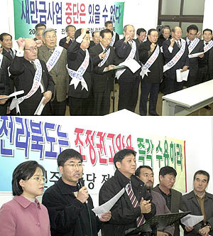 25일 새만금 조정권고안과 관련 민주노동당 전북도당(오른쪽)과 전북도청 및 시·군청 전직공무원 대표들은 전북도청에서 기자회견을 갖고 상반된 견해를 밝혔다.../이강민기자 이강민(lgm19740@jjan.kr)
