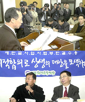 4일 서울행정법원의 새만금사업 판결과 관련, 도청 기자실에서 한계수 행정부지사(위)와 환경단체가 각각 기자회견을 통해 입장표명을 하고 있다.../이강민기자 이강민(lgm19740@jjan.kr)