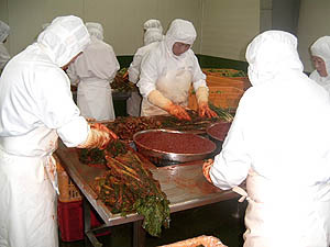 김치의 소비가 비교적 적은 3월인데도 불구하고 직원들은 김치를 만드는데 여념이 없다.