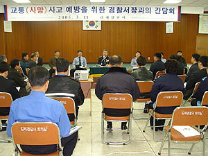 이날 김 서장은 참석자들에게 전년도 교통사고 내용을 분석, 설명하고 “2005년도는 전년대비 교통사고 20%, 사망사고 10% 감소를 목표로 교통시설의 확충과 사고예방 홍보를 병행 실시하는 등 목표달성을 위해 최선을 다 하겠다”고 약속했다.