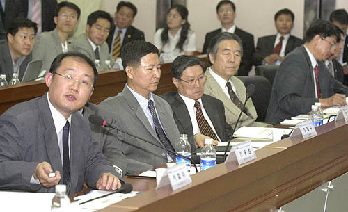 20일 전북발전연구원 회의실에서 열린 '새만금 신항만 개발전략 공청회'에서 안승범 인천대 교수(앞줄 왼쪽)가 새만금 물류단지 개발전략에 대한 주제발표를 하고 있다.../이강민기자 이강민(lgm19740@jjan.kr)
