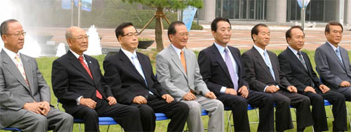 전북도가 전현직 지사들의 모임인 전백회 회원들이 간담회를 갖고 도청사앞에서 기념사진을 찍고 있다. 왼쪽부터 심재홍·조철권·이환의 전지사, 강현욱지사, 고건 전총리, 최용복·강상원·이강년전지사. (desk@jjan.kr)