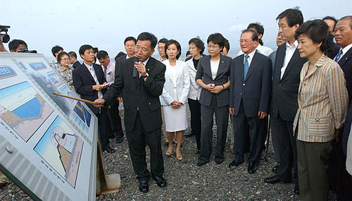 1일 새만금현장을 방문한 박근혜 한나라당 대표와 강현욱지사 등이 사업단 관계자로부터 현황에 대한 설명을 듣고 있다.../새만금사업단 제공 (desk@jjan.kr)