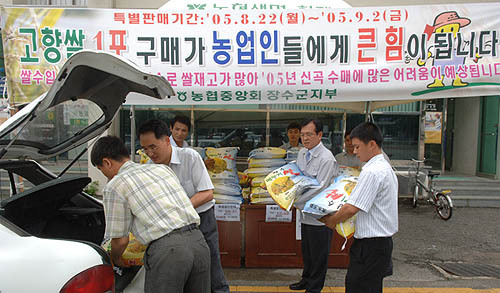 장수군의 재고쌀이 1000여톤이 넘게 남아있는 가운데 곧 햅쌀이 출하될 예정이어서 장수군지부는 이번 기간동안 고향쌀 3000여포대(1억2천여만원 상당) 팔았다.