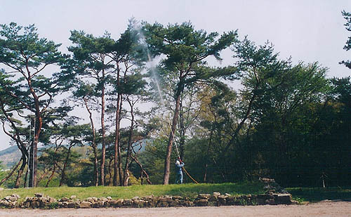 고창군공무원이 고창읍성 주변 아름드리 소나무에 물을 주고 있다. (desk@jjan.kr)