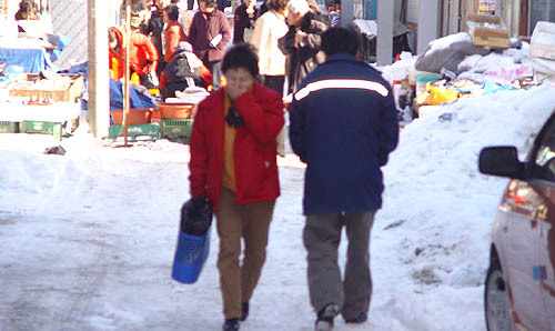 또 시장내 곳곳에 쌓인 1∼2m의 눈덩이에서는 햇볕에 녹은 얼음물이 흐르면서 빙판으로 변해 주민들의 발걸음을 더욱 위태롭게 하고 있다.