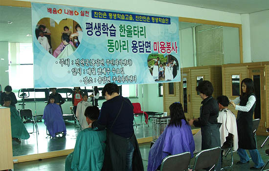용담면주민자치센터(위원장 서태석)는 특별한 문화시설이 없는 상황에서 어린이 및 주부를 위한 ‘영화감상’ 및 ‘주부 노래교실’과 거동불편 노인 및 저소득 세대 등을 대상으로 한 이·미용서비스를 새롭게 시작, 주민들에게 큰 호응을 얻고 있다.