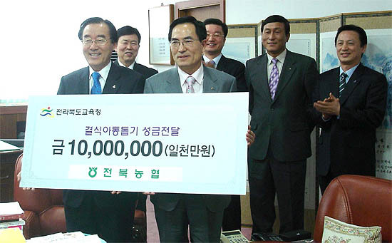 전북농협(본부장 이상준)은 20일 전북도교육청에서 전북지역 결식아동을 돕기 위한 성금 1000만원을 전달하고 학교 단체급식 등을 통한 우리 농축산물 소비확대를 당부했다.