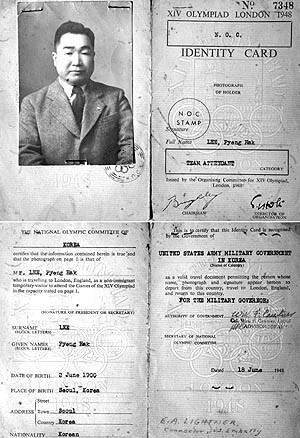 또 정박사와 이씨는 고창고보(현 고창고)에서 각각 국어와 체육을 가르치기도했으며, 특히 이씨는 보성전문학교에 체육교수로 재직하면서 보전송구부를 창단(1939년)해 한국에 7인제 핸드볼을 처음으로 선보였다. 엽서 2장을 합한 크기의 한 장짜리인 이 카드(IDENTITY CARD)는 런던 올림픽(1848.7.29∼8.14)이 열리기 40여일 전인 6월18일 런던올림픽조직위원회에서 발급하고미군정청이 신원을 인증하고 있다.