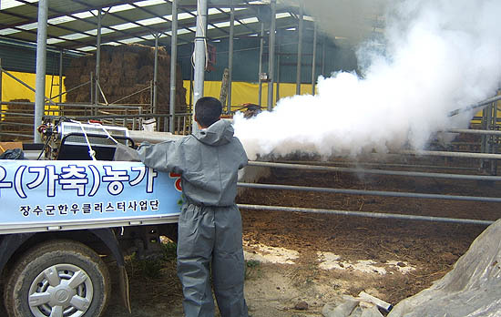 군은 이달부터 11월까지를 방역소독기간으로 정하고 한우협회 회원, 축협 직원 등으로 구성된 읍면별 방역단을 편성하고 연막소독기 2대를 동원, 마을별 축사 방역에 나선 것.