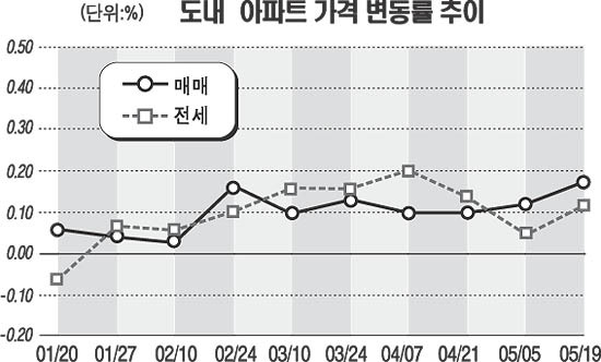 5월 셋째주 도내 아파트 시장은 2주간 매매 0.18% 상승했다. 전세는 0.11% 올랐다. 지난달보다는 상승폭이 다소 커지긴 했지만 비수기로 거래 움직임은 전반적으로 안정세를 이어갔다.