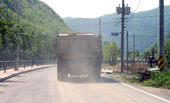 설천면 청량리 도로와 적상면 구간은 공사차량으로 인해 비산먼지가 최고조에 달하고 있으며 대형 차량에서 떨어지는 불순물로 인해 교행 차량이 피해를 입는 등 당국의 단속이 필요한 상태다.