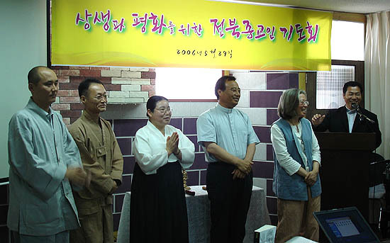 이날 기도회는 상생과 평화를 기원하는 자리인 만큼 전북지역 5개 종단 종교인 30여명이 참석해 각 종단의 의식을 존중하며 함께 기도를 올렸다. 개신교 이강실 목사, 불교 석문 스님, 원불교 최정안 교무, 천도교 일포 이우원 선도사, 천주교 권이복 신부 등 공동대표단이 기도식을 진행했다.