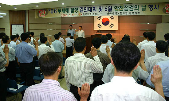 한국전력 전북지사(지사장 한광희)는 5일 지사 강당에서 제25회 산업안전보건 강조기간을 맞아 무재해 달성 결의대회를 가졌다.