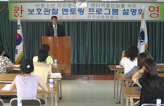 전주보호관찰소(소장 김영홍)는 8일 오후 청사 3층 강당에서 보호관찰 청소년들의 건전한 사회복귀 지원 프로그램으로 전북종합사회복지관(관장 박병만)과 공동으로 비행청소년을 위한 ‘멘토링 발대식’을 가졌다.