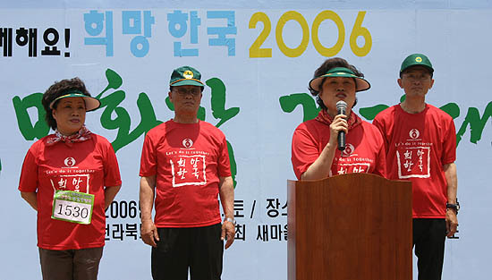 전북도 새마을회(회장 이영조)는 10일 전주천 백제교 인근의 야외 간이공연장에서 ‘함께해요 희망한국’이란 슬로건을 내걸고 전북도민과 새마을지도자 등이 참가한 가운데 국민화합걷기 대회를 개최했다.