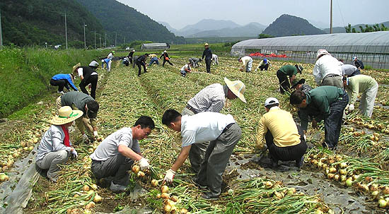 60여명의 직원들이 참여한 이번 봉사활동에서 2000평의 논에서 양파를 수확하고 운반하는 작업을 도와 일손부족으로 적기 모내기 어려움을 덜어준 것.