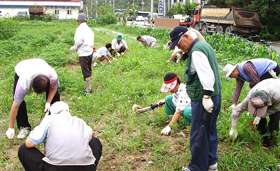 이 날 인후3동에서 추진중인 “은빛농장” 조성의 일환으로 해바라기, 코스모스를 식재한 꽃밭과 고추, 참깨 등을 심은 부지에 성공적인 농장조성을 위한 제초작업(풀매기)를 실시하였다.