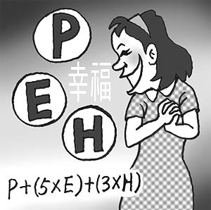 이 세가지 조건중 생존조건인 E가 개인적 특성인 P보다 5배 더 중요하고, 고차원 상태인 H는 E보다 3배 더 중요한데, 이 지수를 공식화하면 P+(5×E)+(3×H)가 된다. 이 공식에 따르면 인간의 행복에는 다른 어떤 요소들보다 건강·돈·인간관계 등이 중요하다는 것이다. 돈이 있어야 건강을 유지하고 인간관계도 맺을 수 있으니 개인의 행복지수는 결국 돈이 핵심인 셈이다.