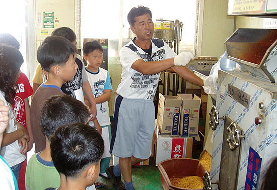 방앗간으로 현장학습 교육에 나선 장수 계북초등 학생들이 기계에 대한 지도교사(학부모)의 설명을 듣고 있다. (desk@jjan.kr)