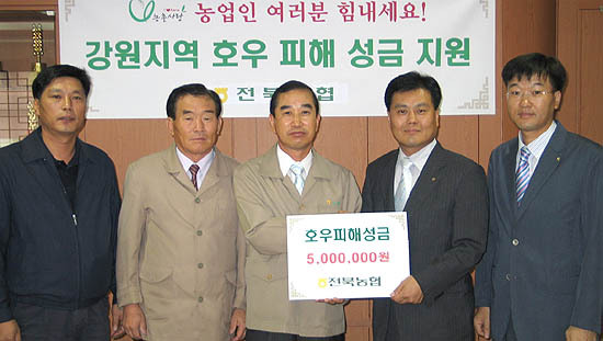전북농협(본부장 이상준)은 폭우로 큰 피해를 입은 강원지역 농업인을 위로하기 위해 지난 21일 강원농협지역본부를 방문, 전북농협 임직원들이 정성을 모아 마련한 수해복구 성금 500만원을 전달했다.