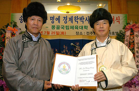 25일 전주 코아리베라 호텔에서 이창승 코아그룹회장이 한국과 몽골과의 경제 교류 활성화에 기여한 공로를 인정받아몽골 국립 체육대 잠스 총장으로 부터 명예 경제학박사 학위를 수여받고 있다.