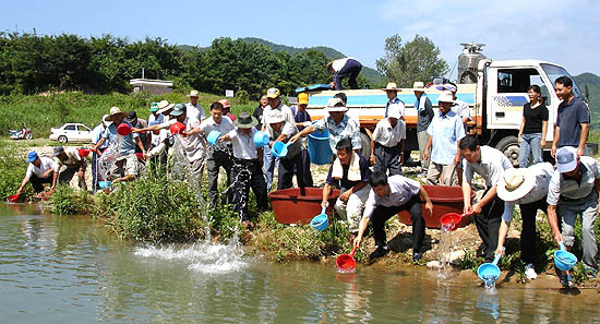 수자원공사 용담댐관리단(단장 김원택)은 7일 용담댐하류의 생태계보전과 토착어종 보호를 위해 용담면 송풍리 섬바위 현지에서 치어를 방류했다.