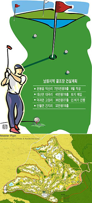 먼저 운봉읍 덕산리 인근 7만5000평에 9홀 규모의 골프장이 오는 9월 착공될 예정이며 대산면 대곡리 일원에는 공무원연금관리공단이 40만평 부지에 18홀의 골프장을 만들기 위해 토지 매입에 착수한 상태다.