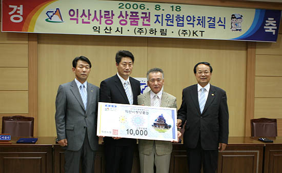 이날 협약식은 KT 익산지사와 더불어 ㈜하림도 함께 하였는데 KT와 하림이 연 1억 5천만원씩 5년간 총 7억 5천만원의 상품권을 구입 사용키로 했다.