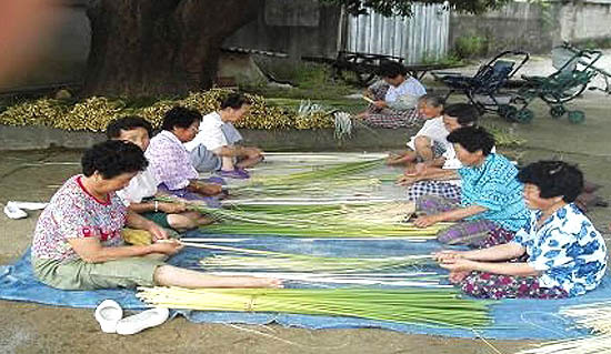 순창 유등면 주민들이 노인일자리사업에 참여해 왕골을 수확한 후 왕골공예품을 만들고 있다. (desk@jjan.kr)