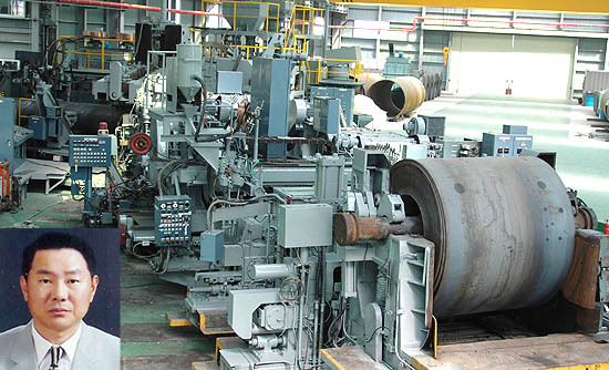 지난해 11월 군장산업단지에 입주한 (주)파이프라인이 일본에서 들여온 최첨단 스파이럴 조관기. 파이프라인은 스파이럴강관만으로 올 360억 매출을 예상하고 있다. 왼쪽아래는 이문호 대표이사. (desk@jjan.kr)