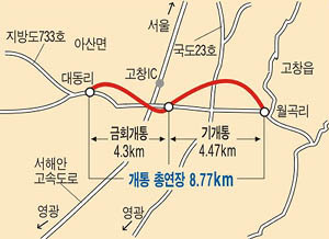 전북도는 총사업비 1079억원을 들여 지난 98년부터 추진해온 아산-고창간 4차로 확포장 공사구간중 미개통 구간 4.47㎞를 20일께 개통할 예정이라고 밝혔다.