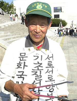 '서로에게 양보하고 기초질서 잘 지켜서 문화국민 됩시다' '아름다운 우리 고장, 자연환경 깨끗하게, 내가 머물던 자리는 깨끗이 치우고 갑시다' 등 흰 티 위에 검은 먹으로 직접 써넣은 교훈적인 문구와 검은색 비닐봉지는 이제 그의 상징이 됐다.