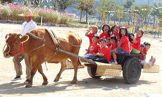 이날 운동회에서 최대 이벤트는 느티마을 이해규씨가 마련한 달구지 퍼레이드로 유치원부터 고학년까지 차례로 달구지 탑승식을 갖은 학생들은 거주지가 시골이지만 소달구지는 처음 타본다는 표정이다.