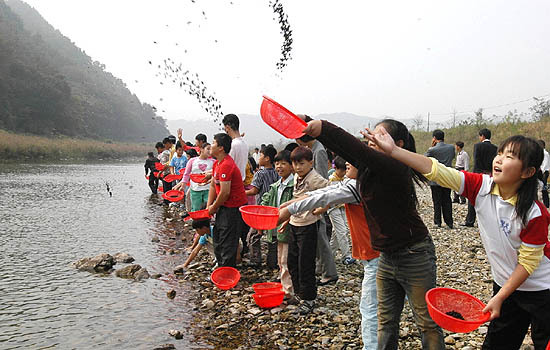 9일 오전 쌍치면 쌍계리∼산천가든 천변 2.0km에서 펼쳐진 방류행사에는 유치원생, 초등학생, 지역노인회원, 마을주민, 리장 등 200여명의 주민이 참여해 높은 관심을 보였다.