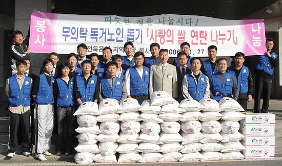 전북은행 지역사랑봉사단(단장 이강본) 40여명은 지난 27일 군산지역 무의탁 독거노인 가정 50여 세대를 찾아 연탄 1만장과 쌀20kg 50포대, 포장육 등을 나눠주는 봉사활동을 실시했다.