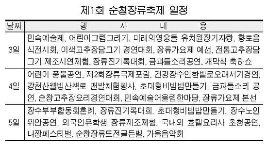4일에는 어린이 풍물공연, 제2회장류국제포럼, 건강장수인한발로오래서기경연, 강천산웰빙산책로맨발체험행사, 초대형비빔밥만들기, 금과들소리 공연, 순창고추장요리경연대회, 민속예술어울림한마당, 장류가요제 본선이 펼쳐져 축제의 흥을 한껏 북돋운다.