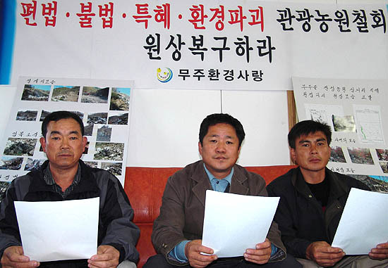 이 단체는 “관광농원을 하면서 보전임지의 난개발과 환경파괴로 덕유산자락의 천연원시림이 파괴되고 있다”며 “즉각 사업철회와 함께 원상복구가 이루어 져야한다”고 8일 기자회견에서 밝혔다.