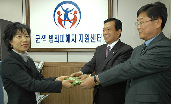 윤여웅 군산·익산범죄피해자지원센터 이사장은 16일 오전 11시30분 전주지검 군산지청내 센터 사무실에서 센터 관계자와 류재우 전주지검 군산지청장 등 지청 관계자들이 참석한 가운데 범죄 피해를 입어 의식불명 상태로 치료받고 있는 최봉순씨(71·여·군산시 신풍동) 가족과 범죄 피해로 부인을 잃은 황추갑씨(52·군산시 조촌동)에게 각각 150만원의 간병비와 100만원의 위로금을 전달하고 위로 격려했다.