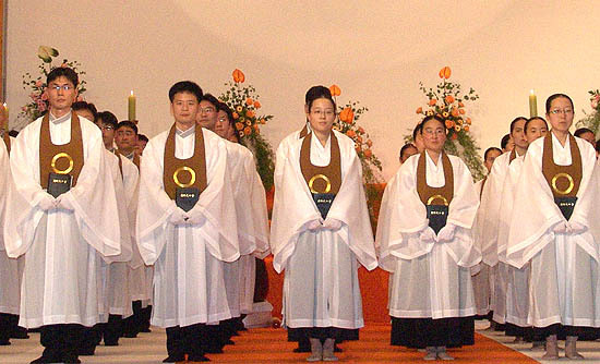 경산 장응철 종법사 등에게서 원불교 의례복인 ‘법락’을 받은 이들은 법신불전 앞에 “마음은 회상에 드리고 몸은 공중에 바쳐서 세세생생에 이 법륜을 떠나지 아니할 것”을 맹세했다.