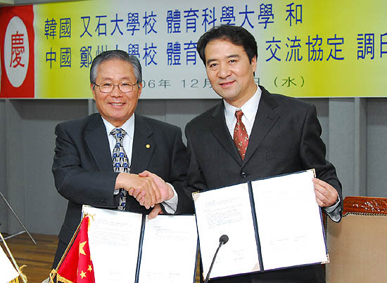 이날 협약식에는 김 총장을 비롯한 송은섭 체육과학대학장, 오석흥 국제교류센터장, 체육관련 학과교수를 비롯해 위진 정주대학교 당서기, 주의강 부원장, 장하영 인사처장 등 양교 관계자가 참석했다.