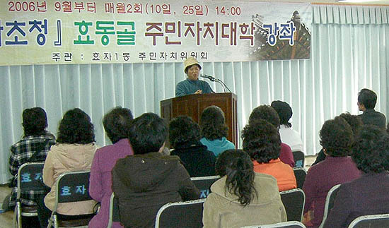 금번 효동골 주민자치대학은 2007년 1. 10일(수) 오후2시 효자1동 2층 대회의실에서 현재 함씨네 토종콩 식품 대표 함 정 희 사장님을 특별강사로 초빙하여 “두부 한모로 바뀐 인생” 이 란 주제로 “인생의 성공 담 및 삶” 에 대한 지식을 60명 정도 참석 주민을 대상으로 특강을 실시 하였다